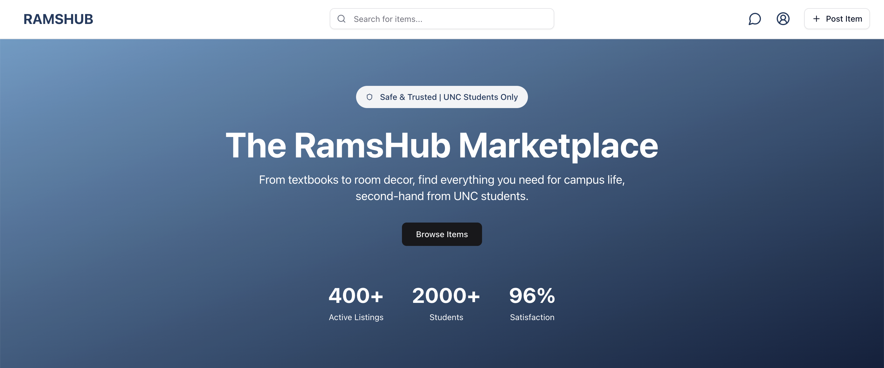 RamsHub is a UNC-exclusive web platform my team and I built that lets students safely buy, sell, and give away items on campus, combining verified email authentication with real-time listings and messaging to keep everything within the Tar Heel community.